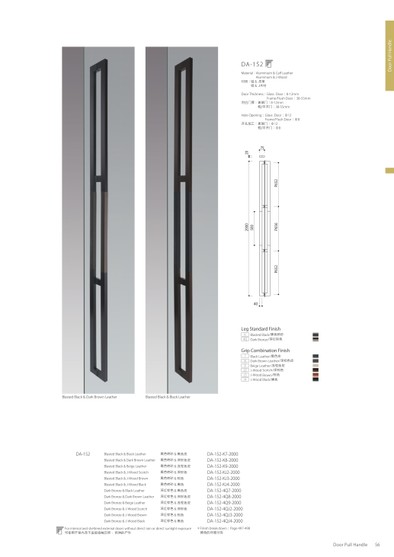 DA-152 MATERIAL:ALUMINIUM&CALFLEATHERALUMINIUM&J-WOOD材质:铝&皮革铝&J木材DOORTHICKNESS:GLASSDOOR:8-12MMDOORTHICKNESS:FRAME/FLUSHDOOR:38-55MM对应门厚:玻璃门:8-12MM对应门厚:框/平开门:38-55MMHOLEOPENING:GLASSDOOR:Φ12HOLEOPENING:FRAME/FLUSHDOOR:Φ8开孔加工:玻璃门:Φ12开孔加工:框/平开门:Φ8LEGSTANDARDFINISHKBLASTEDBLACK/黑色喷砂4QDARKBRONZE/深红棕色GRIPCOMBINATIONFINISH7BLACKLEATHER/黑色皮8DARKBROWNLEATHER/深棕色皮9BEIGELEATHER/浅驼色皮J2J-WOODSCOTCH/深棕色STAINLESSMIRROR不锈钢镜面STAINLESSBRUSHED不锈钢拉丝STAINLESSSCRATCH不锈钢磨砂BRASSMIRROR黄铜镜面BRASSBRUSHED黄铜拉丝BRASSSCRATCHfiNISH黄铜磨砂JWOOD(SCOTCH)J木材(深褐色)1MM桦木单板薄片浸泡树脂,多层热压成型的强化木材。有木质感的同时耐水性也很好。密度高有硬度,比普通的木材强度高出2-4倍。JWOOD(BROWN)J木材(棕色)JWOOD(WHITE)J木材(白色)STAINLESSSTEELSTRIPETUBEPOLISH不锈钢管抛光条BRASSSULFURATE(DARK)铜硫化(深)BRASSSULFURATE(PALE)铜硫化(淡)NATURALWOOD天然木JWOOD(BLACK)/J-BLACKJ木材(黑色)●直射日光には長時間当たらないようにしてください。紫外線により色が褪せてくる場合があります。●汚れは、乾拭きしてください。●アルコール類、シンナー系溶剤、中性洗剤、塩素系洗剤はご使用にならないでください。光沢を失う場合があります。●ワックスを含む布などで拭くと光沢が保てます。●雨水等、ぬれた状態でそのまま放置せず、必ず柔らかい布等で拭取ってください。そのまま放置すると、汚れや色褪せの原因となります。Jウッドは再生することができます。詳しくは弊社までお問い合わせください。DEGRADATIONOVERTIMEANDREFURBISHMENT経年変化と再生●AVOIDPROLONGEDEXPOSURETODIRECTSUNLIGHT.THEPRODUCT’SCOLORMAYBEDETERIORATEDBYULTRAVIOLETRAYS.●REMOVEDIRTANDSTAINSWITHADRYCLOTH.●DONOTUSEALCOHOLS,SOLVENTSSUCHASTHINNER,NEUTRALPHDETERGENT,ORCHLORINECLEANINGAGENTS.THEYMAYDEPRIVETHEPRODUCTOFTHELUSTER.●YOUCANKEEPTHELUSTERBYWIPINGWITHAWAXIMPREGNATEDCLOTH.●WHENTHEPRODUCTGETSWETFROMRAINWATEROROTHERLIQUIDS,DONOTLEAVEIT,BUTDRYITBYWIPINGWITHASOFTCLOTHORTHELIKE.LEAVINGITTODRYMAYRESULTINCREATINGSTAINEDORDISCOLOREDSPOTS.JWOODCANBEREFURBISHED.FORFURTHERDETAILS,PLEASECONTACTUS.MANUFACTURINGMETHOD製造方法ITISREINFORCEDPLYWOODCOMPRISINGABOUT1MMTHICKBIRCHVENEERSRESIN-IMPREGNATEDUNDERVACUUMANDPRESSURIZEDCONDITIONSANDTHENHOTPRESSEDTOMOLDINTOTHESHAPE.1㎜程度のカバ材単板に減圧及び加圧条件化で樹脂を含浸したものを積層して熱圧成型した強化木です。INSTALLATIONCONDITIONS設置条件WHENINSTALLEDOUTDOORS,MAKESURETHATITISEXPOSEDTOSUNLIGHTFORANEXTENDEDPERIODBYINSTALLINGATANENTRANCEUNDEREAVES.JWOODJウッドについて使用開始10年経過再生STARTOFUSEAFTERTENYEARSREFURBISHEDFEATURES特徴INSPITEOFITSWOOD-LIKETEXTURE,ITSHOWSHIGHWATERRESISTANCE.SINCEITHASASPECIFICGRAVITYANDSUFFICIENTHARDNESS,ITALLOWSPROCESSINGSUCHASTAPPING,WHICHISNOTPOSSIBLEWITHORDINARYTIMBER.ITSHARDNESSISTWOTOFOURTIMESGREATERTHANTHATOFORDINARYTIMBER.木質感がありながら耐水性に優れています。比重が高く硬度がありますので、木材ではできないタップ等の加工が可能です。通常の木材の2∼4倍の強度があります。■KAWAJUNWOOD(JWOOD-KJWOOD):ITISAREINFORCEDPLYWOODCONSISTINGOFABOUT1MMTHICKRESIN-IMPREGNATEDBIRCHVENEERSMOLDEDWITHAHOTPRESS.■JWOOD’SFEATURES:INSPITEOFITSWOOD-LIKETEXTURE,ITSHOWSHIGHWATERRESISTANCE.ITISTWOTOFOURTIMESASSTRONGASORDINARYTIMBER,WHILESHOWINGAHIGHSPECIFICGRAVITYANDHARDNESS.屋外に設置する場合は庇のある出入り口に設置して直射日光に長時間当たらないことを確認してください。J3J-WOODBROWN/棕色STAINLESSMIRROR不锈钢镜面STAINLESSBRUSHED不锈钢拉丝STAINLESSSCRATCH不锈钢磨砂BRASSMIRROR黄铜镜面BRASSBRUSHED黄铜拉丝BRASSSCRATCHfiNISH黄铜磨砂JWOOD(SCOTCH)J木材(深褐色1MM桦木单板薄片浸泡树脂,多层热压成型的强化木材。有木质感的同时耐水性也很好。密度高有硬度,比普通的木材强度高出2-4倍。JWOOD(BROWN)J木材(棕色)JWOOD(WHITE)J木材(白色)STAINLESSSTEELSTRIPETUBEPOLISH不锈钢管抛光条BRASSSULFURATE(DARK)铜硫化(深)BRASSSULFURATE(PALE)铜硫化(淡)NATURALWOOD天然木JWOOD(BLACK)/J-BLACKJ木材(黑色)●直射日光には当たうにして。紫外線が褪くるりま●汚れはい。●アルコール類中はご使用にならなさいます●ワックスを含くとてま●雨水等、ぬれ態でその放置ず柔等でってさ、汚せのりまJウッドは再生すでき。詳社ま合わい。DEGRADATIONOVERTIMEANDREFURBISHMENT経年変化と再●AVOIDPROLONGEDEXPOSURETODIRECTSUNLIGHT.THEPRODUCT’SCOLORMAYBEDETERIORATEDBYULTRAVIOLETRAYS.●REMOVEDIRTANDSTAINSWITHADRYCLOTH.●DONOTUSEALCOHOLS,SOLVENTSSUCHASTHINNER,NEUTRALPHDETERGENT,ORCHLORINECLEANINGAGENTS.THEYMAYDEPRIVETHEPRODUCTOFTHELUSTER.●YOUCANKEEPTHELUSTERBYWIPINGWITHAWAXIMPREGNATEDCLOTH.●WHENTHEPRODUCTGETSWETFROMRAINWATEROROTHERLIQUIDS,DONOTLEAVEIT,BUTDRYITBYWIPINGWITHASOFTCLOTHORTHELIKE.LEAVINGITTODRYMAYRESULTINCREATINGSTAINEDORDISCOLOREDSPOTS.JWOODCANBEREFURBISHED.FORFURTHERDETAILS,PLEASECONTACTUS.MANUFACTURINGMETHOD製造方法ITISACOMPRISINGABOUT1MMBIRCHUNDERVACUUMANDTHENHOTTOMOLDINTOTHESHAPE.1㎜程度のカバに加圧条件化含浸もの層しですINSTALLATIONCONDITIONS設置条件WHENINSTALLEDOUTDOORS,MAKESURETHATISDIRECTSUNLIGHTFORANEXTENDEDPERIODBYINSTALLINGATANENTRANCEUNDEREAVES.JWOODJウッド使用開始10年経過再生STARTOFUSEAFTERTENYEARSREFURBISHEDFEATURES特徴INSPITEOFITSITHIGHRESISTANCE.SINCEITANDSUFFICIENTHARDNESS,ITPROCESSINGSUCHASTAPPING,WHICHISNOTPOSSIBLEWITHORDINARYTIMBER.ITSHARDNESSISTWOTOFOURTIMESGREATERTHANTHATOFORDINARYTIMBER.木質感がありないます。く硬ます、木材タッ工が