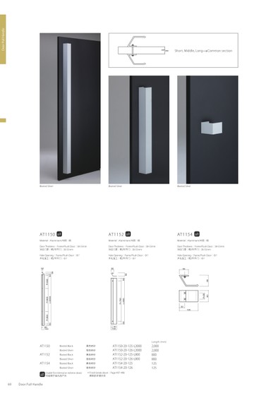 AT1150 MATERIAL:ALUMINIUM/材质:铝DOORTHICKNESS:FRAME/FLUSHDOOR:38-55MM对应门厚:框/平开门:38-55MMHOLEOPENING:FRAME/FLUSHDOOR:Φ7开孔加工:框/平开门:Φ7AT1152 MATERIAL:ALUMINIUM/材质:铝DOORTHICKNESS:FRAME/FLUSHDOOR:38-55MM对应门厚:框/平开门:38-55MMHOLEOPENING:FRAME/FLUSHDOOR:Φ7开孔加工:框/平开门:Φ7AT1154 MATERIAL:ALUMINIUM/材质:铝DOORTHICKNESS:FRAME/FLUSHDOOR:38-55MM对应门厚:框/平开门:38-55MMHOLEOPENING:FRAME/FLUSHDOOR:Φ7开孔加工:框/平开门:Φ7USABLEFORINTERNALOREXTERIORDOORS可使用于室内及户外*FINISHBREAKDOWN:PAGE497-498颜色的详细分类DOORPULLHANDLEDOORPULLHANDLE6970SHORT,MIDDLE,LONG→COMMONSECTIONL=200050P=500P=900P=50050585030100L=800P=7005050505810030501003060P=3258BLASTEDSILVERBLASTEDSILVERBLASTEDSILVERLENGTH(MM)AT1150BLASTEDBLACK黑色喷砂AT1150-20-125-L20002,000BLASTEDSILVER银色喷砂AT1150-20-126-L20002,000AT1152BLASTEDBLACK黑色喷砂AT1152-20-125-L800800BLASTEDSILVER银色喷砂AT1152-20-126-L800800AT1154BLASTEDBLACK黑色喷砂AT1154-20-125125BLASTEDSILVER银色喷砂AT1154-20-126125