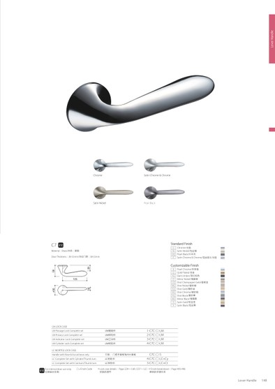 □=FINISHCODEFORINTERNALDOORUSEONLY仅限室内专用*LOCKCASEDETAILS:PAGE229~(LM)/237~(LC)*FINISHBREAKDOWN:PAGE495-496锁盒的细节颜色的详细分类CHROMESATINNICKELSATINCHROME&CHROMEPEARLBLACKSTANDARDFINISHCCHROME/光铬NSATINNICKEL/拉丝镍GQPEARLBLACK/珍珠黑JCSATINCHROME&CHROME/拉丝铬&光铬CUSTOMIZABLEFINISHBPEARLCHROME/珍珠铬GGOLDPLATED/本金4QDARKUMBER/深红棕色DMIRRORNICKEL/镜面镍LQSHOTCHAMPAGNEGOLD/香槟金MQSHOTNICKEL/磨砂镍KQSHOTGOLD/磨砂金NQSHOTCHROME/磨砂铬PQSHOTBLACK/磨砂黑8QMIRRORBLACK/镜面黑HSATINGOLD/拉丝金ASATINBLACK/拉丝黑LEVERHANDLELEVERHANDLE147148Φ50295812516C7MATERIAL:BRASS/材质:黄铜DOORTHICKNESS:38-55MM/对应门厚:38-55MMLMLOCKCASELMPASSAGELOCKCOMPLETESETLM通道锁1-C7C-□-LMLMPRIVACYLOCKCOMPLETESETLM保险锁2-C7C-□-LMLMINDICATORLOCKCOMPLETESETLM卫浴锁3-C7C-□-LMLMCYLINDERLOCKCOMPLETESETLM钥匙锁4-C7C-□-LMLCMORTISELOCKCASEHANDLEWITHROSE&ESCUTCHEONONLY只是,门把手面板和内衬面板C7C-□-SLCCOMPLETESETWITHCYLINDER/THUMBTURNLC钥匙锁4-C7C-□-LC+CYLCCOMPLETESETWITHCOINTURN/THUMBTURNLC保险锁3-C7C-□-LC+CT