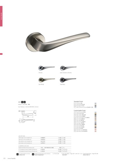 □=FINISHCODEFORINTERNALDOORUSEONLY仅限室内专用USABLEFORHOTELGUESTROOMENTRANCE可使用于酒店客房进户*LOCKCASEDETAILS:PAGE229~(LM)/237~(LC)*FINISHBREAKDOWN:PAGE495-496锁盒的细节颜色的详细分类STANDARDFINISHCCHROME/光铬NSATINNICKEL/拉丝镍GQPEARLBLACK/珍珠黑JCSATINCHROME&CHROME/拉丝铬&光铬CUSTOMIZABLEFINISHBPEARLCHROME/珍珠铬GGOLDPLATED/本金4QDARKUMBER/深红棕色DMIRRORNICKEL/镜面镍LQSHOTCHAMPAGNEGOLD/香槟金MQSHOTNICKEL/磨砂镍KQSHOTGOLD/磨砂金NQSHOTCHROME/磨砂铬PQSHOTBLACK/磨砂黑8QMIRRORBLACK/镜面黑HSATINGOLD/拉丝金ASATINBLACK/拉丝黑JQROSEGOLD/粉金SQSHOTROSEGOLD/磨砂粉金TQSATINROSEGOLD/拉丝粉金LEVERHANDLELEVERHANDLE155156CHROMESATINCHROME&CHROMESATINNICKELPEARLBLACK8.5Φ5036621281281050178A8MATERIAL:BRASS/材质:黄铜DOORTHICKNESS:38-55MM/对应门厚:38-55MMLMLOCKCASELMPASSAGELOCKCOMPLETESETLM通道锁1-A8C-□-LMLMPRIVACYLOCKCOMPLETESETLM保险锁2-A8C-□-LMLMINDICATORLOCKCOMPLETESETLM卫浴锁3-A8C-□-LMLMCYLINDERLOCKCOMPLETESETLM钥匙锁4-A8C-□-LMLCMORTISELOCKCASEHANDLEWITHROSE&ESCUTCHEONONLY只是,门把手面板和内衬面板A8C-□-SLCCOMPLETESETWITHCYLINDER/THUMBTURNLC钥匙锁4-A8C-□-LC+CYLCCOMPLETESETWITHCOINTURN/THUMBTURNLC保险锁3-A8C-□-LC+CT