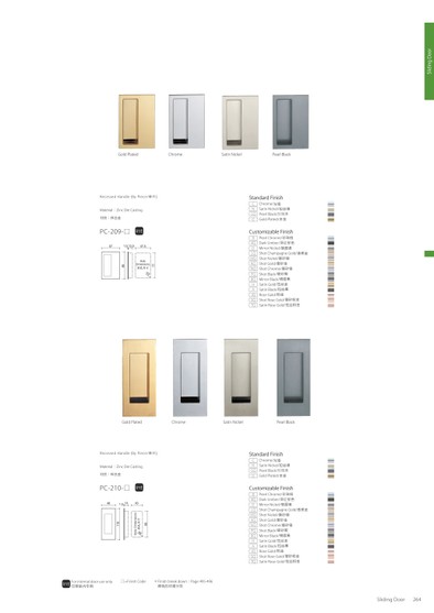 □=FINISHCODEFORINTERNALDOORUSEONLY仅限室内专用*FINISHBREAKDOWN:PAGE495-496颜色的详细分类GOLDPLATEDCHROMESATINNICKELPEARLBLACKGOLDPLATEDSATINNICKELCHROMEPEARLBLACKRECESSEDHANDLE(BYPIECE/单片)MATERIAL:ZINCDIECASTING材质:锌合金PC-209-□ RECESSEDHANDLE(BYPIECE/单片)MATERIAL:ZINCDIECASTING材质:锌合金PC-210-□ STANDARDFINISHCCHROME/光铬NSATINNICKEL/拉丝镍GQPEARLBLACK/珍珠黑GGOLDPLATED/本金CUSTOMIZABLEFINISHBPEARLCHROME/珍珠铬4QDARKUMBER/深红棕色DMIRRORNICKEL/镜面镍LQSHOTCHAMPAGNEGOLD/香槟金MQSHOTNICKEL/磨砂镍KQSHOTGOLD/磨砂金NQSHOTCHROME/磨砂铬PQSHOTBLACK/磨砂黑8QMIRRORBLACK/镜面黑HSATINGOLD/拉丝金ASATINBLACK/拉丝黑JQROSEGOLD/粉金SQSHOTROSEGOLD/磨砂粉金TQSATINROSEGOLD/拉丝粉金STANDARDFINISHCCHROME/光铬NSATINNICKEL/拉丝镍GQPEARLBLACK/珍珠黑GGOLDPLATED/本金CUSTOMIZABLEFINISHBPEARLCHROME/珍珠铬4QDARKUMBER/深红棕色DMIRRORNICKEL/镜面镍LQSHOTCHAMPAGNEGOLD/香槟金MQSHOTNICKEL/磨砂镍KQSHOTGOLD/磨砂金NQSHOTCHROME/磨砂铬PQSHOTBLACK/磨砂黑8QMIRRORBLACK/镜面黑HSATINGOLD/拉丝金ASATINBLACK/拉丝黑JQROSEGOLD/粉金SQSHOTROSEGOLD/磨砂粉金TQSATINROSEGOLD/拉丝粉金SLIDINGDOORSLIDINGDOOR2632648547.55777R313.51.5HOLEDIMENSIONS开孔尺寸HOLEDIMENSIONS开孔尺寸481101.5144090R6