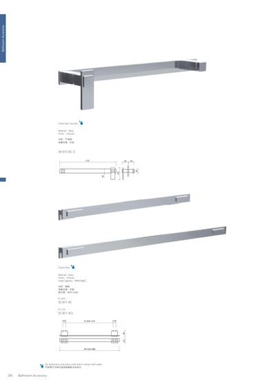 FORBATHROOMSANDPLACESWITHDIRECTCONTACTWITHWATER可使用于浴室内直接接触到水的地方BATHROOMACCESSORYBATHROOMACCESSORY2852864832P26P26P=424・574W=536・686SC-811-XX50501033838510TOWELRAILMATERIAL:BRASSFINISH:CHROMELOADCAPACITY:98N(10KGF)材质:黄铜表面处理:光铬耐负重:98N(10KGF)P=424SC-811-XCP=574SC-811-XCLTOWELBARHANDLEMATERIAL:BRASSFINISH:CHROME材质:不锈钢表面处理:光铬SH-017-XC-3
