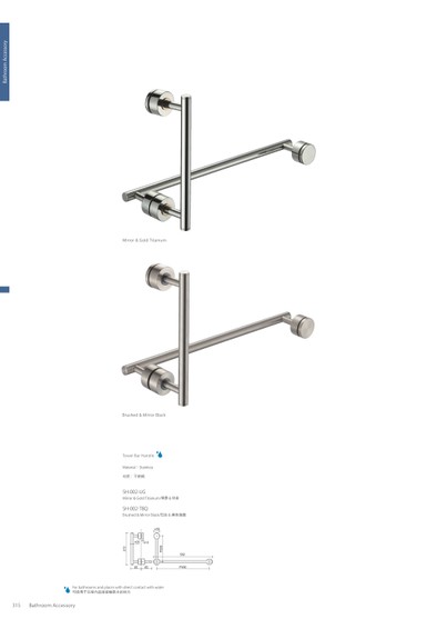FORBATHROOMSANDPLACESWITHDIRECTCONTACTWITHWATER可使用于浴室内直接接触到水的地方BATHROOMACCESSORYBATHROOMACCESSORY315316BRUSHED&MIRRORBLACKMIRROR&GOLDTITANIUMΦ20P450502P220272Φ508512.585TOWELBARHANDLEMATERIAL:STAINLESS材质:不锈钢SH-002-UGMIRROR&GOLDTITANIUM/镜面&钛金SH-002-T8QBRUSHED&MIRRORBLACK/拉丝&黑色镜面
