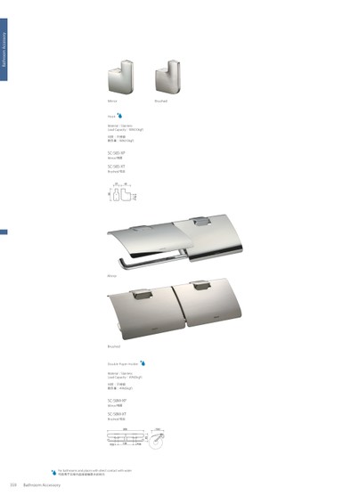 FORBATHROOMSANDPLACESWITHDIRECTCONTACTWITHWATER可使用于浴室内直接接触到水的地方BATHROOMACCESSORYBATHROOMACCESSORY359360MIRRORDOUBLEPAPERHOLDERMATERIAL:STAINLESSLOADCAPACITY:49N(5KGF)材质:不锈钢耐负重:49N(5KGF)SC-58M-XPMIRROR/镜面SC-58M-XTBRUSHED/拉丝HOOKMATERIAL:STAINLESSLOADCAPACITY:98N(10KGF)材质:不锈钢耐负重:98N(10KGF)SC-585-XPMIRROR/镜面SC-585-XTBRUSHED/拉丝BRUSHEDMIRRORBRUSHED4050P18.523(104)305P2612865P26