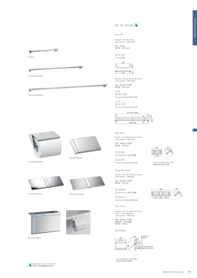 AVOIDDIRECTCONTACTWITHWATER使用于不直接接触到水的地方CHROME&BRUSHEDCHROME&MIRRORCHROME&MIRRORCHROME&BRUSHEDCHROME&MIRRORCHROME&BRUSHEDCHROME&BRUSHEDCHROMEBATHROOMACCESSORYBATHROOMACCESSORY390SC-31SERIES2147P1972205427.5W=472.5・722.510P450・70019・CANBEINSTALLEDASLEFT-SIDED・安装时可变更为左向型ATLEAST60FROMTHEWALL从墙壁开始计算,须60以上137ATLEAST20须20以上(92)88P11045288・CANBEINSTALLEDASLEFT-SIDED・安装T时可变更为左向型(92)138P8020(93)20265P83P83P60PAPERHOLDERMATERIAL:ZINCDIECASTING&STAINLESSFINISH:CHROME&MIRRORLOADCAPACITY:49N(5KGF)材质:锌合金&不锈钢表面处理:光铬&镜面耐负重:49N(5KGF)SC-31M-XCPAPERHOLDERMATERIAL:ZINCDIECASTING&STAINLESSLOADCAPACITY:49N(5KGF)材质:锌合金&不锈钢耐负重:49N(5KGF)SC-313-XCCHROME&MIRROR/光铬&镜面SC-313-CTCHROME&BRUSHED/光铬&拉丝DOUBLEPAPERHOLDERMATERIAL:ZINCDIECASTING&STAINLESSLOADCAPACITY:49N(5KGF)材质:锌合金&不锈钢耐负重:49N(5KGF)SC-31W-XCCHROME&MIRROR/光铬&镜面SC-31W-CTCHROME&BRUSHED/光铬&拉丝TOWELRAILMATERIAL:ZINCDIECASTINGLOADCAPACITY:98N(10KGF)材质:锌合金耐负重:98N(10KGF)SC-311-XCCHROME/光铬MATERIAL:ZINCDIECASTING&STAINLESSLOADCAPACITY:98N(10KGF)材质:锌合金&不锈钢耐负重:98N(10KGF)P=450SC-311-CTMCHROME&BRUSHED/光铬&拉丝P=700SC-311-CTLCHROME&BRUSHED/光铬&拉丝
