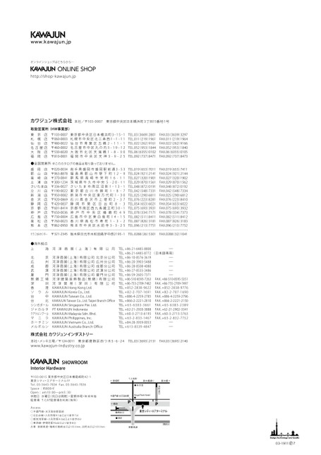 03-1911P7〒103-0015東京都中央区日本橋箱崎町42-1東京シティ・エアターミナル1FTel.03-5643-7834Fax.03-5643-7836Space:約800㎡Open:am10:00̶pm5:30休館日水曜日(祝日は開館)・夏期休暇・年末年始駐車場T-CAT駐車場を利用〈有料〉Access○半蔵門線・水天宮前駅直結○日比谷線・人形町駅A1出口より徒歩7分○都営浅草線・人形町駅A3出口より徒歩8分○東西線・茅場町駅4b出口より徒歩8分お車首都高速・箱崎IC箱崎出口より0.5km、浜町出口より0.5km←茅場町↑人形町新大橋通り新大橋→●水天宮●IBM隅田川←銀座PP箱崎出口浜町出口半蔵門線水天宮前駅●東京シティ・エアターミナル首都高速RoyalParkHotelwww.kawajun.jp〒103-0007東京都中央区日本橋浜町3ー15ー1〒060-0003札幌市中央区北三条西1ー1ー11〒980-0022仙台市青葉区五橋2ー11ー1〒460-0002名古屋市中区丸の内3ー19ー12〒530-6020大阪市北区天満橋1ー8ー30〒810-0001福岡市中央区天神3-9-25〒020-0034岩手県盛岡市盛岡駅前通3-53〒963-8878福島県郡山市堤下町12ー9〒370-0841群馬県高崎市栄町16-11〒300-1234茨城県牛久市中央5-20-11〒336-0027さいたま市南区沼影1ー13ー1〒190-0022東京都立川市錦町1ー8ー7〒950-0082新潟市中央区東万代町1ー30〒920-0869石川県金沢市上堤町2ー37〒420-0837静岡市葵区日出町8ー3〒601-8414京都市南区西九条蔵王町30ー1〒650-0036神戸市中央区播磨町49〒730-0004広島市中区東白島町14ー15〒760-0023香川県高松市寿町1ー3ー2〒862-0950熊本市中央区水前寺3-3-25〒321-2345栃木県日光市木和田島字中原2195ー1カワジュン株式会社本社/〒103-0007東京都中央区日本橋浜町3丁目15番地1号株式会社カワジュンインダストリー東京店札幌店仙台店名古屋店大阪店福岡店盛岡店郡山店高崎店土浦店さいたま店立川店新潟店金沢店静岡店京都店神戸店広島店高松店熊本店テクニカルセンターTEL.03(3669)2801FAX.03(3639)3297TEL.011(219)1961FAX.011(219)1964TEL.022(262)9161FAX.022(262)9166TEL.052(953)1844FAX.052(953)1840TEL.06(6355)0102FAX.06(6355)0105TEL.092(737)8471FAX.092(737)8473TEL.019(653)7011FAX.019(653)7411TEL.024(921)2141FAX.024(921)2144TEL.027(320)1901FAX.027(320)1902TEL.029(870)1561FAX.029(870)1562TEL.048(872)0191FAX.048(872)0192TEL.042(548)7331FAX.042(548)7334TEL.025(290)6811FAX.025(290)6812TEL.076(223)8281FAX.076(223)8410TEL.054(653)6021FAX.054(653)6022TEL.075(693)3931FAX.075(693)3932TEL.078(334)7171FAX.078(334)7373TEL.082(511)8411FAX.082(511)8412TEL.087(826)3181FAX.087(826)3183TEL.096(213)7751FAX.096(213)7752TEL.0288(26)5301FAX.0288(32)1041本社・メッキ工場/〒124-0011東京都葛飾区四つ木5ー6ー24TEL.03(3693)2131FAX.03(3693)2140www.kawajun-industry.co.jp取扱営業所(HW事業部)●全国営業所※このカタログの商品は取り扱っておりません。●海外拠点河淳商貿(上海)有限公司河淳商貿(上海)有限公司北京分公司河淳商貿(上海)有限公司広州分公司河淳商貿(上海)有限公司成都分公司河淳商貿(上海)有限公司武漢分公司河淳商貿(上海)有限公司厦門分公司河淳建築装飾製品(無錫)有限公司河淳貿易(深圳)有限公司KAWAJUNHongKongLtd.KAWAJUNKoreaCo.,Ltd.KAWAJUNTaiwanCo.,Ltd.KAWAJUNTaiwanCo.,Ltd.TaipeiBranchOfficeKAWAJUNSingaporePte.Ltd.PTKAWAJUNIndonesiaKAWAJUNMalaysiaSdn.Bhd.KAWAJUNPhilippines,Inc.KAWAJUNVietnamCo.,Ltd.KAWAJUNAustraliaBranchOffice上海北京広州成都武漢厦門無錫工場深圳香港ソウル台中台北シンガポールジャカルタクアラルンプールマニラホーチミンメルボルン+86-510-8595-5351+86-755-2709-7497+852-2838-9776+82-2-707-1690+886-4-2259-2796+866-2-2221-2150+65-6383-2389+62-21-2902-3341+60-3-2713-5763+63-2-832-7752FAX.FAX.FAX.FAX.FAX.FAX.FAX.FAX.FAX.FAX.(日本語専用)TEL.TEL.TEL.TEL.TEL.TEL.TEL.TEL.TEL.TEL.TEL.TEL.TEL.TEL.TEL.TEL.TEL.TEL.TEL.+86-21-6485-8800+86-21-6485-8772+86-10-8576-3619+86-20-3903-5488+86-28-8508-4080+86-27-8535-3486+86-59-2605-7371+86-510-8595-7263+86-755-2709-7482+852-2838-9622+82-2-707-1691+886-4-2259-2785+866-2-2221-2810+65-6383-3661+62-21-2920-3888+60-3-2713-6195+63-2-833-1467+84-28-3939-0053+613-8539-4847オンラインショップはこちらから…http://shop-kawajun.jp