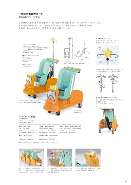 68ボンベホルダーCylinderHolderカート後部にボンベが載せられるホルダーが装備されています。注)ボンベは付属していません。子供向けお散歩カートCharacterCartforKids小児病棟での患者の散歩等に最適なカートで、子供が好きな自動車をモチーフにしたデザインになっています。患者の様子が確認できるバックミラーや安全シートベルトなど、機能や安全性にも配慮されています。点滴スタンド付の仕様や、ボンベを搭載できる仕様も用意しています。本体フレーム:アルミ(塗装)本体カバー・シート:ABS・PE・PPキャスター:前φ100エラストマー車(自在・静音仕様)後φ100エラストマー車(固定)自重:18.5kg適正年齢:2歳~4歳用●ガートル台セット(点滴スタンド)ポール:アルミフレーム:スチールハンガー:ステンレス星部:ABS●ボンベホルダーフレーム:スチールミラーが前部に付き、保護者がカートを押しながら患者の様子を確認できます。ハンドル部にはフックが左右に付いておりバッグなどの手荷物を引っ掛けられます。(均等耐荷重:5kg)ネスティングによりコンパクトに収納できます。ネスティング寸法:488(ガートル台付:503)注)ボンベホルダー付はネスティング不可。962664560(643)921(1375~1850)クーミーパルCA橙CoumePalCAカート+ガートル台Cart+DripStandガートル台DripStandカート+ボンベホルダーCart+CylinderHolderボンベホルダーCylinderHolderカート+ガートル台+ボンベホルダーCart+DripStand+CylinderHolderMIN1354MAX1894φ25φ507上部ポールを引っ張るだけで上方に伸びます。下げる時は可動レバーと一緒に下げます。※ガートル台は左右入れ替え可能。ネームホルダー上部ポール可動レバーガートル台DripStand上部に40×25サイズのカードが入る星型のホルダーが付いています。ItemNo.Price(JPY)/ea.MCR095OR¥135,000ItemNo.Price(JPY)/ea.MOP018GL¥36,000ItemNo.Price(JPY)/ea.MCR096OR¥109,000ItemNo.Price(JPY)/ea.MOP019GL¥10,000ItemNo.Price(JPY)/ea.MCR097OR¥145,000ItemNo.Price(JPY)/ea.CAA008OR¥99,000ガートル台+ボンベホルダー付きCart+DripStand+CylinderHolderクーミーパルCACoumePalCA※ガートル台は、カートに連結するホルダーとのセットになります。受
