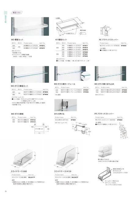 D27棚板先端部271615.59.3122610416100°KV3段ブラケット15°30°KV棚板W備品リスト調剤什器MD棚板セット呼びW呼びDProductnameKV棚板セットItemNo.呼びW呼びDProductname600900200MD棚板セット(S79259)MTM075MD棚板セット(S79260)MTM076WH(ホワイト)※耐荷重10㎏※スライドケース積載可能数W600/6個、W900/10個600900300400500300400500KV棚板セット(S77637)KV棚板セット(S77639)KV棚板セット(S77641)KV棚板セット(S77657)KV棚板セット(S77659)KV棚板セット(S77661)ItemNo.MTM077MTM078MTM079MTM080MTM081MTM082WH(ホワイト)●セット内容KV棚板:1枚、KV3段ブラケット:2本NEブラケットストッパーNEブラケットストッパー(ストック棚セット用)PRブラケットストッパー(ガラス棚セット用)ProductnameItemNo.NEブラケットストッパー(070630)MTM0831N(透明)●KV棚板セット用(50ケ入)MDガラス棚板セット呼びW呼びDProductnameItemNo.600900150MDガラス棚板セット(S79262)MTM085MDガラス棚板セット(S79263)MTM086CH(クロームメッキ)●セット内容:PR-Nスリムガラス棚ブラケット2本、●セット内容:13角振れ止めバー2本※ガラス棚は別途手配(下記「MDガラス棚板」より選択)※耐荷重10㎏MDガラス棚カードレールMDガラス棚こぼれ止め呼びWProductnameItemNo.呼びWProductnameItemNo.600900MDガラス棚カードレール(078824)MDガラス棚カードレール(078825)MTM087MTM088600900MDガラス棚こぼれ止め(078826)MDガラス棚こぼれ止め(078827)MTM089MTM0901N(透明)WH(ホワイト)MDガラス棚板呼びWProductname600900MDガラス棚板60MDガラス棚板90ItemNo.MTM123MTM12460606060ガラス棚(5.0t)185W-1ガラス押さえProductnameItemNo.ガラス押さえ(0F7145)MTM091CH(クロームメッキ)19PRブラケットストッパーProductnameItemNo.PRブラケットストッパー(058740)MTM08434.5φ101N(透明)●MDガラス棚板セット用(50ケ入)16.525.591615.59.312261041610NEブラケットストッパー(ストック棚セット用)PRブラケットストッパー(ガラス棚セット用)802351302358888スライドケースH80ProductnameItemNo.スライドケースH80透明MSL041TPスライドケースH130ProductnameItemNo.スライドケースH130透明MSL042TP透明※棚間85mmに設置したMD棚板セットで使用すると後部の脱落防止機能が働きます。透明※棚間150mmに設置したMD棚板セットで使用すると後部の脱落防止機能が働きます。積み重ねできます。(H80とH130でも積み重ね可能)薬剤の取説などを折りたたんで入れられるポケット付きネームカード等が入るポケット2つ付き(カードサイズW73×H20)78