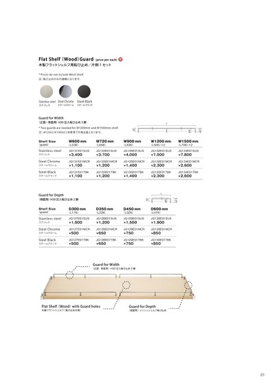 20FLATSHELF(WOOD)GUARD(PRICEPEREACH)木製フラットシェルフ用転び止め/片側1セット受STAINLESSSTEELステンレスSTEELCHROMEスチールクロームSTEELBLACKスチールブラックGUARDFORWIDTH(正面・背面用)H30圧入転び止め3脚STAINLESSSTEELSTEELCHROMESTEELBLACKSHELFSIZE(GUARD)SHELFSIZE(GUARD)W600MM(L536)JG131E01SUS¥3,400JG131E01MCR¥1,100JG131E01TBK¥1,100W720MM(L656)JG133E01SUS¥3,700JG133E01MCR¥1,200JG133E01TBK¥1,200W900MM(L836)JG135E01SUS¥4,000JG135E01MCR¥1,400JG135E01TBK¥1,400W1200MM(L556)×2JG132E01SUS¥7,000JG132E01MCR¥2,300JG132E01TBK¥2,300W1500MM(L706)×2JG134E01SUS¥7,800JG134E01MCR¥2,600JG134E01TBK¥2,600ステンレススチールクロームスチールブラック*TWOGUARDSARENEEDEDFORW1200MMANDW1500MMSHELF.注)W1200とW1500は2本使用で片側全面となります。L42.530Φ6GUARDFORDEPTH(側面用)H30圧入転び止め2脚STAINLESSSTEELSTEELCHROMESTEELBLACKD300MM(L176)JG127E01SUS¥1,000JG127E01MCR¥500JG127E01TBK¥500D350MM(L226)JG128E01SUS¥1,200JG128E01MCR¥650JG128E01TBK¥650D450MM(L326)JG129E01SUS¥1,500JG129E01MCR¥750JG129E01TBK¥750D600MM(L476)JG130E01SUS¥1,900JG130E01MCR¥850JG130E01TBK¥850ステンレススチールクロームスチールブラックL42.530Φ6GUARDFORWIDTH(正面・背面用)H30圧入転び止め3脚FLATSHELF(WOOD)WITHGUARDHOLES木製フラットシェルフ(転び止め仕様)GUARDFORDEPTH(側面用)メッシュシェルフ転び止め*PRICESDONOTINCLUDEMESHSHELF.注)転び止めのみの価格になります。