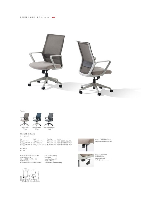 ロッキング強弱調整ダイヤルLockingstrengthadjustmentdialロッキング角度固定・座面高さ調整レバーLockinganglexed/SeatheightadjustmentleverBeige/Grege/WhiteDarkgrey/Navy/WhiteDarkgrey/Darkgrey/BlackREIKELCHAIRライケルチェアFrame/LegSeatWhite(ホワイト)Beige(べージュ)Darkgrey(ダークグレイ)Navy(ネイビー)White(ホワイト)Darkgrey(ダークグレイ)Darkgrey(ダークグレイ)Black(ブラック)BackGrege(グレージュ)ItemNo.VOH-020-HT-MGL-FBLVOH-020-HT-MNV-FGDVOH-020-KB-MGD-FGDPrice(JPY)/ea.¥22,700座面:ウレタン(ファブリック生地)背面:メッシュ生地フレーム/脚部/キャスター:PA重量:10.4kg※この製品は組立てが必要になります。Seat:Urethane(fabric)Back:MeshFrame/Leg/Caster:PAWeight:10.4kg*isproductrequiresassembly.590480415640615(mm)930~1030618~718415~515VariationREIKELCHAIRライケルチェアNEW