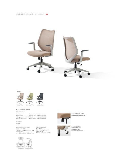 ロッキング強弱調整ダイヤルLockingstrengthadjustmentdialロッキング角度固定・座面高さ調整レバーLockinganglexed/SeatheightadjustmentleverBeige/WhiteYellowgreen/WhiteDarkgrey/BlackCALMLEICHAIRカームライチェアFrame/LegSeat/BackBeige(ベージュ)White(ホワイト)VOH-021-HT-MBLYellowgreen(イエローグリーン)White(ホワイト)VOH-021-HT-MYGDarkgrey(ダークグレイ)Black(ブラック)VOH-021-KB-MGDItemNo.Price(JPY)/ea.¥22,800座面:ウレタン(メッシュ生地)背面:メッシュ生地フレーム/アーム/脚部/キャスター:PA重量:9.7kg※この製品は組立てが必要になります。Seat:Urethane(mesh)Back:MeshFrame/Arm/Leg/Caster:PAWeight:9.7kg*isproductrequiresassembly.590480415640620(mm)940~1025618~718415~515VariationCALMLEICHAIRカームライチェアNEW