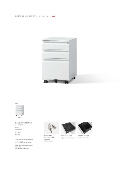 KLUDRECABINETクルドラキャビネットNEWColorWhiteKLUDRECABINETクルドラキャビネットItemNo.VOH-036-HTPrice(JPY)/ea.¥29,400本体:スチール(ホワイト粉体塗装)キャスター:PAサイズ:W395×D510×H600Body:Steel(whitepowdercoated)Caster:PASize:W395×D510×H600施錠キー2個付※オールロック機能Lockingkey*Alllockfunction上段はペントレー付き下段仕切り板1枚付きUppersectionwithpentrayIncludes1lowerdivider