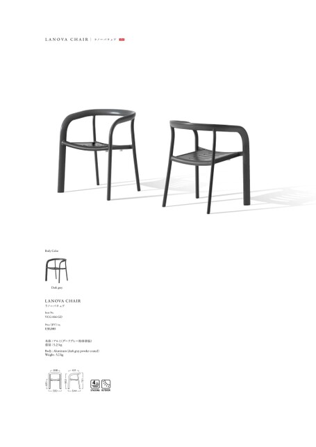 LANOVACHAIRラノーバチェアNEWBodyColorDarkgrayLANOVACHAIRラノーバチェアItemNo.VCG-036-GDPrice(JPY)/ea.¥38,000本体:アルミ(ダークグレー粉体塗装)重量:5.2kgBody:Aluminum(darkgraypowdercoated)Weight:5.2kg388431701663420550544