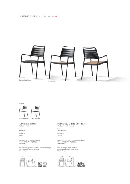 PURWORTOCHAIRプルウォルトチェアNEWPurwortoChairCushionPurwortoChairBodyColorBlack/LightbrownBlack/DarkgrayPURWORTOCHAIRプルウォルトチェアPURWORTOCHAIRCUSHIONプルウォルトチェアクッションItemNo.VCG-046-WLPrice(JPY)/ea.¥54,000ItemNo.VCG-046-F-GDPrice(JPY)/ea.¥62,200座面:PU(ダークグレーインテグラルスキンフォーム)フレーム:アルミ(ブラック粉体塗装)重量:6.1kg443492835Seat:PU(darkgreyintegralskinfoam)Frame:Aluminum(blackpowdercoated)Weight:6.1kg624435537680(mm)座面:アルミ(ライトブラウン木目熱転写)フレーム:アルミ(ブラック粉体塗装)重量:5.3kgSeat:Aluminum(lightbrownwoodgrainheattransferprinting)Frame:Aluminum(blackpowdercoated)Weight:5.3kg537680(mm)835624450835680(mm)443835624435537492624450537680(mm)492443492443
