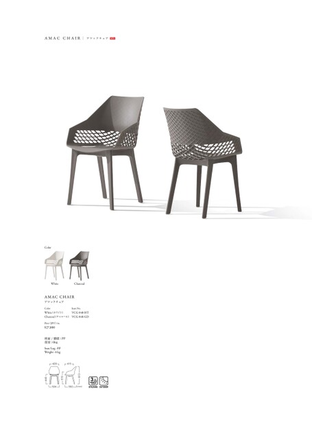 AMACCHAIRアマックチェアNEWWhiteCharcoalAMACCHAIRアマックチェアItemNo.ColorWhite(ホワイト)VCG-048-HTCharcoal(チャコール)VCG-048-GD428415504550(mm)813570440Price(JPY)/ea.¥27,800座面/脚部:PP重量:6kgSeat/Leg:PPWeight:6kgColor