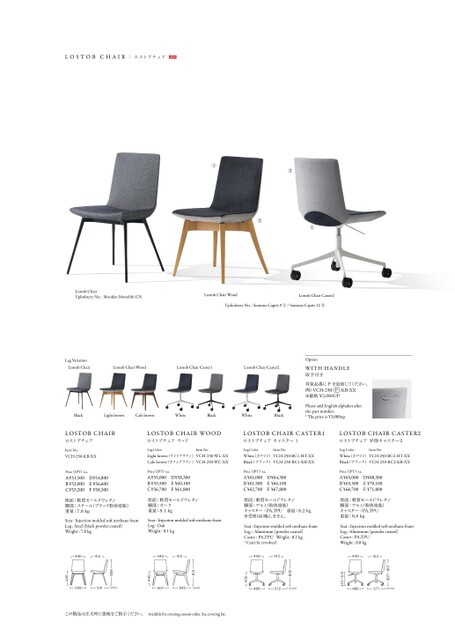 LOSTOBCHAIRロストブチェアNEW①②②①LostobChairUpholsteryNo.:MoridenMonolithCNLostobChairWoodLostobChairCaster2UpholsteryNo.:SuntoneCapris9①/SuntoneCapris12②LegVariationLostobChairLostobChairWoodLostobChairCaster1LostobChairCaster2BlackLightbrownCafebrownWhiteBlackWhiteBlackOptionWITHHANDLE取手付き対象品番にPを追加してください。例)VCH-250-P-KB-XX※価格¥3,000UPPleaseaddEnglishalphabetaerthepartnumber.*epriceis¥3,000up.LOSTOBCHAIRWOODロストブチェアウッドLOSTOBCHAIRCASTER1ロストブチェアキャスター1LOSTOBCHAIRCASTER2ロストブチェア昇降キャスター2LegColorLightbrown(ライトブラウン)VCH-250-WL-XXCafebrown(カフェブラウン)VCH-250-WC-XXItemNo.ItemNo.LegColorWhite(ホワイト)VCH-250-BC1-HT-XXBlack(ブラック)VCH-250-BC1-KB-XXItemNo.LegColorWhite(ホワイト)VCH-250-BC2-HT-XXBlack(ブラック)VCH-250-BC2-KB-XXLOSTOBCHAIRロストブチェアItemNo.VCH-250-KB-XXPrice(JPY)/ea.A¥51,500B¥52,000C¥53,200D¥54,800E¥56,600F¥58,300Price(JPY)/ea.A¥55,000B¥55,500C¥56,700D¥58,300E¥60,100F¥61,800座面:軟質モールドウレタン脚部:スチール(ブラック粉体塗装)重量:7.8kg座面:軟質モールドウレタン脚部:オーク重量:8.1kgSeat:InjectionmoldedsourethanefoamLeg:Steel(blackpowdercoated)Weight:7.8kgSeat:InjectionmoldedsourethanefoamLeg:OakWeight:8.1kg4404404124124404404124404402412412440440124400412Price(JPY)/ea.A¥61,000B¥61,500C¥62,700D¥64,300E¥66,100F¥67,800座面:軟質モールドウレタン脚部:アルミ(粉体塗装)キャスター:PA,TPU重量:8.2kg※受座は回転しません。Seat:InjectionmoldedsourethanefoamLeg:Aluminum(powdercoated)Caster:PA,PUWeight:8.2kg*Can'tberevolvedPrice(JPY)/ea.A¥65,000B¥65,500C¥66,700D¥68,300E¥70,100F¥71,800座面:軟質モールドウレタン脚部:アルミ(粉体塗装)キャスター:PA,TPU重量:8.8kgSeat:InjectionmoldedsourethanefoamLeg:Aluminum(powdercoated)Caster:PA,TPUWeight:8.8kg412124404402440440412412412440412440412807~907807~907486m)571(mm)410~510571807~907832486mm)410~510807~907571572(m)486486()71832435410~510486572410~510832813486(m)(m)50950941(mm)41509(mm)507541509507m)54254152(mm)507(mm)(mm)542486507(mm)8652542572(mm435832813435445435813808445813808445440445808440808440440この製品は注文時に張地をご指示ください。Availableforcoveringcustom-order.Seecoveringlist.