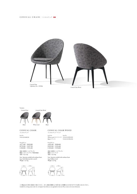 ConicalChairUpholsteryNo.:UP5984ConicalChairWoodBlackWhitewoodBlackCONICALCHAIRコニカルチェアItemNo.VCH-253-KB-XXPrice(JPY)/ea.A¥77,500B¥78,500C¥80,900D¥83,900E¥87,700F¥91,100座面:軟質モールドウレタン脚部:スチール(ブラック粉体塗装)重量:12.1kgCONICALCHAIRWOODコニカルチェアウッドLegColorWhitewood(ホワイトウッド)Black(ブラック)ItemNo.VCH-253-WH-XXVCH-253-WK-XXPrice(JPY)/ea.A¥82,200B¥83,200C¥85,600D¥88,600E¥92,400F¥95,800座面:軟質モールドウレタン脚部:ラバーウッド重量:12.5kgSeat:InjectionmoldedsourethanefoamLeg:Steel(blackpowdercoated)Weight:12.1kgSeat:InjectionmoldedsourethanefoamLeg:RubberwoodWeight:12.5kg47247244544547247245445616616591(mm)591(mm)616616591(mm)591(mm)842842460460842842460460VariationConicalChairConicalChairWoodこの製品は注文時に張地をご指示ください。また、張地の種類により張り加工が困難なものがありますのでお問い合わせください。Availableforcoveringcustom-order.Seecoveringlist.Somefabricsarenotapplicableinthisitem.Pleasecontactusformoreinformation.CONICALCHAIRコニカルチェアNEW