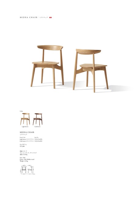 MIDNACHAIRミドナチェアNEWLightbrownCafebrownMIDNACHAIRミドナチェアFrameColorLightbrown(ライトブラウン)VCH-254-WLCafebrown(カフェブラウン)VCH-254-WCItemNo.座面:オークフレーム:オーク、ラバーウッド重量:6.4kgSeat:OakFrame:Oak,RubberwoodWeight:6.4kg465406531511(mm)726440Price(JPY)/ea.¥73,100Color