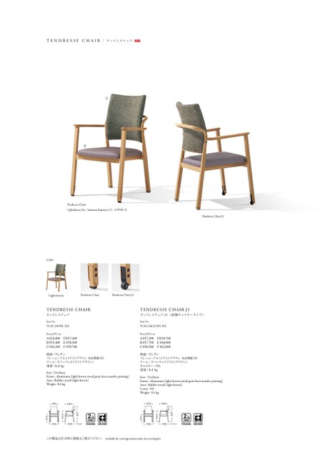 TendresseChairUpholsteryNo.:SuntoneEjimera3①/UP793②TendresseChairJ1LightbrownTendresseChairTendresseChairJ1TENDRESSECHAIRタンドレスチェアTENDRESSECHAIRJ1タンドレスチェアJ1(前脚キャスタータイプ)ItemNo.VCH-230-WL-XXPrice(JPY)/ea.A¥55,000B¥55,400C¥56,200D¥57,400E¥58,500F¥59,700ItemNo.VCH-230-J1-WL-XXPrice(JPY)/ea.A¥57,300B¥57,700C¥58,500D¥59,700E¥60,800F¥62,000座面:ウレタンフレーム:アルミ(ライトブラウン木目熱転写)アーム:ラバーウッド(ライトブラウン)重量:8.4kgSeat:UrethaneFrame:Aluminum(lightbrownwoodgrainheattransferprinting)Arm:Rubberwood(lightbrown)Weight:8.4kg座面:ウレタンフレーム:アルミ(ライトブラウン木目熱転写)アーム:ラバーウッド(ライトブラウン)キャスター:PA重量:8.4kgSeat:UrethaneFrame:Aluminum(lightbrownwoodgrainheattransferprinting)Arm:Rubberwood(lightbrown)Caster:PAWeight:8.4kg450449450450449449450449867613410867867613613410410867613410ColorTENDRESSECHAIRタンドレスチェアNEW①②558565(mm)558558565565(mm)(mm)558565(mm)この製品は注文時に張地をご指示ください。Availableforcoveringcustom-order.Seecoveringlist.