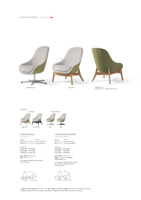 ①②ColitoSofaStandColitoSofaUpholsteryNo.:Santoneute1①/MoridenSolomonG②COLITOSOFAコリートソファLegColorLightbrown(ライトブラウン)VSF-135-WL-XXDarkbrown(ダークブラウン)VSF-135-WD-XXItemNo.Price(JPY)/ea.A¥161,500B¥163,000C¥166,400D¥170,900E¥176,300F¥181,200座面:軟質モールドウレタン脚部:ホワイトアッシュSeat:InjectionmoldedsourethanefoamLeg:WhiteAshCOLITOSOFASTANDコリートソファスタンドItemNo.LegColorSilver(シルバー)VSF-135-SD1-XXBlack(ブラック)VSF-135-SD1-KB-XXPrice(JPY)/ea.A¥166,600B¥168,000C¥171,500D¥175,900E¥181,300F¥186,200座面:軟質モールドウレタン脚部:アルミ(メラミン焼付塗装)※受座は回転します。Seat:InjectionmoldedsourethanefoamLeg:Aluminum(melaminecoated)*Canberevolved909415909856670775(mm)72(mm)670742(mm)642415400856(mm)642775400522511522522511504522504LightbrownDarkbrownSilverBlackLegVariationColitoSofaColitoSofaStandこの製品は注文時に張地をご指示ください。また、張地の種類により張り加工が困難なものがありますのでお問い合わせください。Availableforcoveringcustom-order.Seecoveringlist.Somefabricsarenotapplicableinthisitem.Pleasecontactusformoreinformation.COLITOSOFAコリートソファNEW