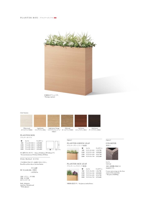 LightbrownVintageライトブラウンヴィンテージ(WLV)Oldwoodオールドウッド(WF)Cafebrownカフェブラウン(WC)Darkbrownダークブラウン(WD)Option-1PLANTERGREENLEAFプランターグリーンリーフ(植栽)W900120015001800ItemNo.VCP-353-850VCP-353-1150VCP-353-1450VCP-353-1750Price(JPY)/ea.¥81,700¥105,000¥131,700¥153,400PLANTERMIXLEAFプランターミックスリーフ(植栽)W900120015001800ItemNo.VCP-354-850VCP-354-1150VCP-354-1450VCP-354-1750Price(JPY)/ea.¥81,700¥105,000¥131,700¥153,400※植栽は造花です。*eplantsarearticialowers.Option-2CHAMFER角落としItemNo.VOP-102本体上部四隅の角加工は¥8,000UPです。Cornerprocessingonthefourcornersofthemainbody.*epriceis¥8,000up.900W300(mm)ColorVariationWhitewoodホワイトウッド(WH)Lightbrownライトブラウン(WL)PLANTERBOXプランターボックスW900120015001800ItemNo.VCA-005-900-□VCA-005-1200-□VCA-005-1500-□VCA-005-1800-□Price(JPY)/ea.¥129,000¥168,000¥196,000¥222,000※上部内寸は、Wから-40mm、Dは260mm、深さ100mmです。*einnerdimensionsareW-40mm,D260mm,DP100mm.OrderMethod注文方法ご注文時は□内にカラー品番をご記入ください。PleasellineachboxwithanColorItemNumber.カラー品番例)VCA-005-900-WHColorItemNo本体:メラミン、ポリ合板内箱:ポリ合板※アジャスター付Body:Melamineinnerbox:Polyplywood*WithadjustersPLANTERBOXプランターボックスNEW※植栽はオプションです。*Plantingisoptional.
