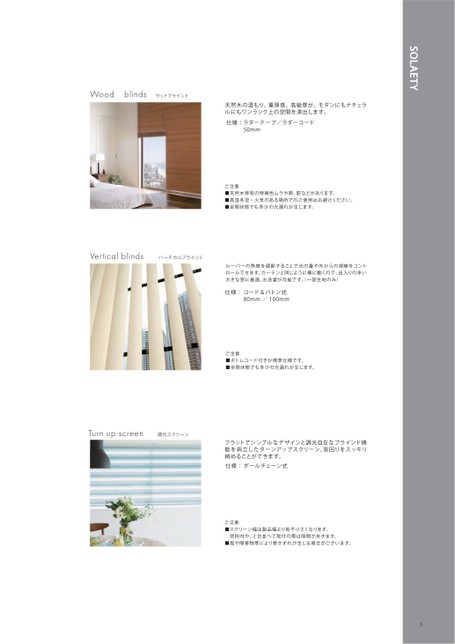 SOLAETY3Woodblindsウッドブラインド天然木の温もり、重厚感、高級感が、モダンにもナチュラルにもワンランク上の空間を演出します。仕様:ラダーテープ/ラダーコード50mmVerticalblindsバーチカルブラインドご注意■天然木特有の特徴色ムラや節、筋などがあります。■高温多湿・火気のある場所でのご使用はお避けください。■全閉状態でも多少の光漏れが生じます。ルーバーの角度を調節することで光の量や外からの視線をコントロールできます。カーテンと同じように横に動くので、出入りの多い大きな窓に最適。お洗濯が可能です。(一部生地のみ)仕様:コード&バトン式80mm/100mmご注意■ボトムコード付きが標準仕様です。■全閉状態でも多少の光漏れが生じます。Turnupscreen調光スクリーンフラットでシンプルなデザインと調光自在なブラインド機能を両立したターンアップスクリーン。窓回りをスッキリ納めることができます。仕様:ボールチェーン式ご注意■スクリーン幅は製品幅より若干小さくなります。窓枠内や、2台並べて取付の際は隙間があきます。■風や障害物等により巻きずれが生じる場合がございます。