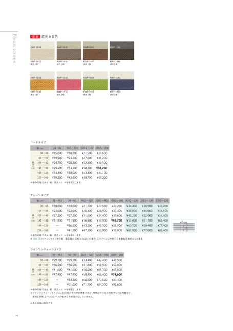 7cm50-8080.5-120120.5-160160.5-200200.5-230200.5-230200.5-230¥18,000¥22,600¥27,200¥31,900¥36,500¥41,100¥21,100¥26,400¥31,600¥36,900¥42,200¥47,500¥23,500¥28,900¥34,400¥39,900¥45,300¥50,900¥27,200¥33,400¥39,600¥45,700¥51,900¥58,000¥34,400¥38,900¥46,200¥53,400¥60,700¥67,900¥38,900¥44,600¥52,900¥61,100¥69,400¥77,600¥43,700¥54,100¥59,400¥68,400¥77,400¥86,40033-49.5¥18,000¥22,600¥27,200¥31,900--幅(cm)30-6061-100101-140141-180181-220221-260さ高(cm)※製作可能寸法は、幅:高さ=1:6を限度とします。※■スクリーンジョイント仕様製品幅が200.5cm以上の場合、スクリーンは中央で2枚重ね合わせになります。チェーンタイプ幅(cm)24-8080.5-120120.5-160160.5-20030-6061-100101-140141-180181-220221-260¥15,000¥19,900¥24,700¥29,500¥34,400¥39,200¥18,700¥23,500¥28,300¥33,200¥38,000¥42,900¥21,500¥27,600¥32,800¥38,100¥43,400¥48,700¥24,600¥31,200¥36,500¥38,700¥44,100¥49,200さ高(cm)※製作可能寸法は、幅:高さ=1:8を限度とします。コードタイプ50-8080.5-120120.5-160160.5-200¥29,100¥36,500¥41,600¥47,400¥54,300¥61,000¥33,400¥41,800¥50,000¥58,400¥66,600¥71,700¥42,400¥51,900¥61,300¥68,400¥77,500¥84,500¥45,900¥57,000¥65,800¥74,600¥83,400¥92,60039-49.5¥29,100¥36,500¥41,600¥47,400--幅(cm)30-6061-100101-140141-180181-220221-260さ高(cm)ツインワンチェーンタイプ※製作可能寸法は、幅:高さ=1:6を限度とします。※ツインワンチェーンタイプは上記の組み合わせが標準ですが、標準以外の組み合わせも対応可能です。厚地と厚地、レースとレースの組み合わせは対応していません。※表示価格は税別です。16防炎遮光A8色KWP-1044KWP-1045KWP-1045KWP-1046KWP-1442遮光3級KWP-1445遮光2級KWP-1447遮光2級KWP-1448遮光2級KWP-1044KWP-1044KWP-1044KWP-1044KWP-1450遮光3級KWP-1452遮光2級KWP-1453遮光2級KWP-1455遮光2級Pleatsscreen