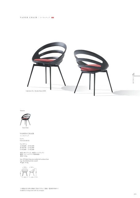 CHAIRこの製品は注文時に張地をご指示ください。張地一覧参照P604〜)Availableforcoveringcustom-order.Seecoveringlist.095VANERCHAIRベーネルチェアNEWUpholsteryNo.:MoridenBatonDOR座面:PP(ブラック)、軟質モールドウレタン脚部:スチール(ブラック粉体塗装)重量:9.1kgSeat:PP(black),InjectionmoldedsofturethanefoamLeg:Steel(blackpowdercoated)Weight:9.1kg443437600579(mm)768460VANERCHAIRベーネルチェアItemNo.VCH-262-KB-XX¥51,500¥51,900¥52,400DEFPrice(JPY)/ea.¥50,600¥50,700¥51,000ABCVanerChairVariation