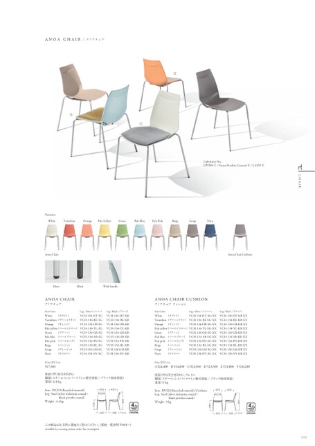 CHAIRANOACHAIRアノアチェア③②①UpholsteryNo.:UP5598①/PasayaRosalineCaramel②/L-6339③VariationWhiteVermilionOrangePaleYellowGreenPaleBluePalePinkBeigeGregeNavyAnoaChairAnoaChairCushionSilverBlackWithhandleANOACHAIRアノアチェアANOACHAIRCUSHIONアノアチェアクッション(ホワイト)(オレンジ)Leg/Silver(シルバー)SeatColorVCH-136-HT-SGWhiteVermilion(ヴァーミリオン)VCH-136-RE-SGOrangeVCH-136-OR-SGPaleyellow(ペールイエロー)VCH-136-YL-SG(グリーン)GreenVCH-136-GR-SG(ペールブルー)PaleblueVCH-136-SB-SGPalepink(ペールピンク)VCH-136-PN-SGBeigeVCH-136-BL-SGGregeVCH-136-GM-SGNavyVCH-136-NV-SG(ベージュ)(グレージュ)(ネイビー)Leg/Black(ブラック)VCH-136-HT-KBVCH-136-RE-KBVCH-136-OR-KBVCH-136-YL-KBVCH-136-GR-KBVCH-136-SB-KBVCH-136-PN-KBVCH-136-BL-KBVCH-136-GM-KBVCH-136-NV-KB(ホワイト)(オレンジ)Leg/Silver(シルバー)SeatColorVCH-136-HT-SG-XXWhiteVermilion(ヴァーミリオン)VCH-136-RE-SG-XXOrangeVCH-136-OR-SG-XXPaleyellow(ペールイエロー)VCH-136-YL-SG-XX(グリーン)GreenVCH-136-GR-SG-XX(ペールブルー)PaleblueVCH-136-SB-SG-XXPalepink(ペールピンク)VCH-136-PN-SG-XXBeigeVCH-136-BL-SG-XXGregeVCH-136-GM-SG-XXNavyVCH-136-NV-SG-XX(ベージュ)(グレージュ)(ネイビー)Leg/Black(ブラック)VCH-136-HT-KB-XXVCH-136-RE-KB-XXVCH-136-OR-KB-XXVCH-136-YL-KB-XXVCH-136-GR-KB-XXVCH-136-SB-KB-XXVCH-136-PN-KB-XXVCH-136-BL-KB-XXVCH-136-GM-KB-XXVCH-136-NV-KB-XXPrice(JPY)/ea.¥17,500Price(JPY)/ea.A¥24,400B¥24,600C¥24,900D¥25,300E¥25,800F¥26,200座面:PP(再生材52%)脚部:スチール(シルバーメラミン焼付塗装/ブラック粉体塗装)重量:4.4kg座面:PP再生材52%)、ウレタン脚部:スチール(シルバーメラミン焼付塗装/ブラック粉体塗装)重量:5kg426400800445800Seat:PP(52%Recycledmaterial),UrethaneLeg:Steel(silvermelaminecoated/blackpowdercoated)Weight:5kg800430400426400426400426445800430Seat:PP(52%Recycledmaterial)Leg:Steel(silvermelaminecoated/blackpowdercoated)Weight:4.4kg460528(mm)460528(mm)460528(mm)460528(mm)この製品は注文時に張地をご指示ください。張地一覧参照P604〜)Availableforcoveringcustom-order.Seecoveringlist.111