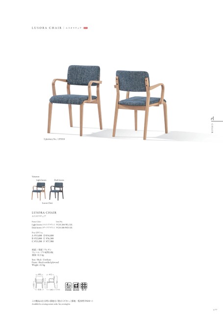 CHAIR506540(mm)布バネこの製品は注文時に張地をご指示ください。張地一覧参照P604〜)Availableforcoveringcustom-order.Seecoveringlist.177LUSORACHAIRルスオラチェアNEWUpholsteryNo.:UP5918VariationLightbrownDarkbrownLusoraChairLUSORACHAIRルスオラチェアFrameColorLightbrown(ライトブラウン)VCH-280-WL-XXDarkbrown(ダークブラウン)VCH-280-WD-XXItemNo.¥54,600¥56,300¥57,900DEFPrice(JPY)/ea.¥51,600¥52,000¥53,200ABC座面/背面:ウレタンフレーム:ブナ成型合板重量:6.3kgSeat/Back:UrethaneFrame:BeechmoldedplywoodWeight:6.3kg439412769619430
