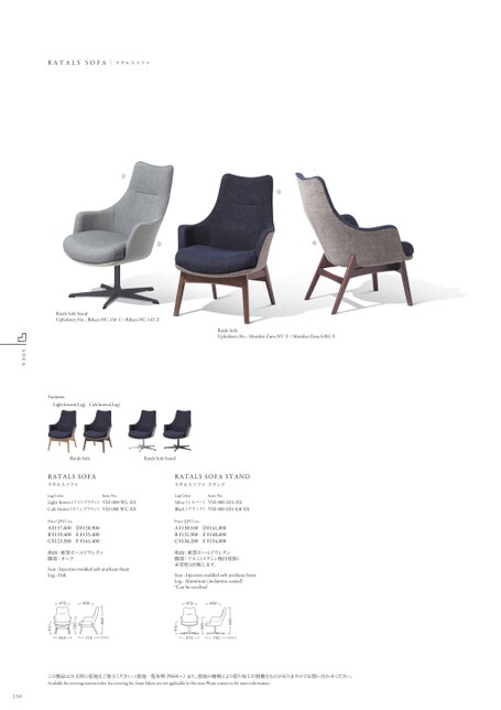 SOFARATALSSOFAラタルスソファ①③②④RatalsSofaStandUpholsteryNo.:RibacoNC-136①/RibacoNC-143②RatalsSofaUpholsteryNo.:MoridenZimaNV③/MoridenZimaGRG④RatalsSofaRatalsSofaStandRATALSSOFAラタルスソファLegColorLightbrown(ライトブラウン)VSF-088-WL-XXCafebrown(カフェブラウン)VSF-088-WC-XXItemNo.Price(JPY)/ea.A¥117,600B¥119,400C¥123,500D¥128,900E¥135,400F¥141,400座面:軟質モールドウレタン脚部:オークSeat:InjectionmoldedsofturethanefoamLeg:OakRATALSSOFASTANDラタルスソファスタンドItemNo.LegColorSilver(シルバー)VSF-088-SD1-XXBlack(ブラック)VSF-088-SD1-KB-XXPrice(JPY)/ea.A¥130,100B¥131,900C¥136,200D¥141,800E¥148,600F¥154,800座面:軟質モールドウレタン脚部:アルミ(メラミン焼付塗装)※受座は回転します。Seat:InjectionmoldedsofturethanefoamLeg:Aluminum(melaminecoated)*Canberevolved645710(mm)645670710(mm)730(mm)670730(mm)94058594041096058410595960410595410479499479499479499479499VariationLightbrown(Leg)Cafebrown(Leg)この製品は注文時に張地をご指示ください。張地一覧参照P604〜)また、張地の種類により張り加工が困難なものがありますのでお問い合わせください。Availableforcoveringcustom-order.Seecoveringlist.Somefabricsarenotapplicableinthisitem.Pleasecontactusformoreinformation.250