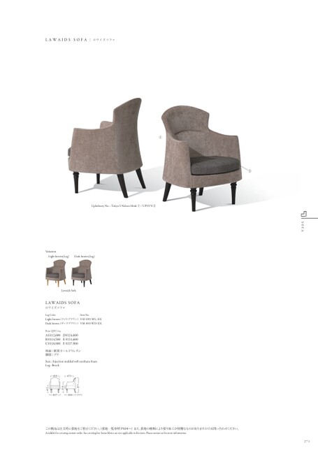 SOFALAWAIDSSOFAロワイズソファ①②UpholsteryNo.:TokyoSNelsonMink①/UP5578②VariationLightbrown(Leg)Darkbrown(Leg)LawaidsSofaLAWAIDSSOFAロワイズソファLegColorLightbrown(ライトブラウン)VSF-093-WL-XXDarkbrown(ダークブラウン)VSF-093-WD-XXItemNo.Price(JPY)/ea.A¥112,600B¥114,500C¥118,900D¥124,600E¥131,600F¥137,900座面:軟質モールドウレタン脚部:ブナSeat:InjectionmoldedsofturethanefoamLeg:Beech627656(mm)871616415495473この製品は注文時に張地をご指示ください。張地一覧参照P604〜)また、張地の種類により張り加工が困難なものがありますのでお問い合わせください。Availableforcoveringcustom-order.Seecoveringlist.Somefabricsarenotapplicableinthisitem.Pleasecontactusformoreinformation.271