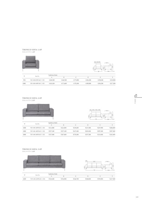 SOFA2001200/1400/160W435W890(mm)826586435200550/600550DEF¥184,300¥198,200¥210,900890(mm)826586LWRW550/600¥24,200550/600200¥217,300550435200435¥189,800200435890DTRONCOSOFA1.0Pトロンコソファ1.0PW9501000ItemNo.VSF-108-095WAD-□-XXVSF-108-100WAD-□-XXUpholsteryRankA¥160,300¥165,100B¥166,500¥171,600C¥172,900¥178,100TRONCOSOFA2.0Pトロンコソファ2.0P435826890200(mm)5862005501800RW1800L826586W890(mm)W890(mm)826586435200550/6005502001200/1400/1600W550826890(mm)586890(mm)RW550L¥342,400(mm)W5502001200/1400/16004351200/1400/1600¥,300435200¥287,200826435¥321,000(mm)890¥265,100¥297,500435¥247,300550¥267,900¥286,600890F890EWW890(mm)C¥230,400¥247,100¥278,300826550586W160018002000ItemNo.UpholsteryRankABVSF-108-160WAD-□-XX¥211,800¥221,000VSF-108-180WAD-□-XX¥227,10020050/600550/6002,100200VSF-108-200WAD-□-XX¥257,000LR¥267,600826586550826890(mm)18005862002005504351800RW1800LW826DEF890C890B¥368,000¥393,900¥417,500435¥346,00435¥334,900UpholsteryRank550A826¥323,200890(mm)826586RWLW2001200/1400/1600(mm)1200/1400/1600550200(mm)890550(mm)435890W890(mm)890(mm)890W586435ItemNo.435VSF-108-220WAD-□-XX826586W890(mm)W2200890(mm)826586LWRW00550/600550/600200550200550/6005502001200/1400/1600550435200435TRONCOSOFA3.0Pトロンコソファ3.0P0018001800200550289