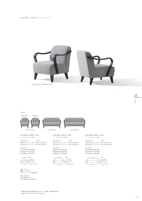 FAURELSOFA1.0Pファーレルソファ1.0PFAURELSOFA2.0Pファーレルソファ2.0PFAURELSOFA3.0Pファーレルソファ3.0PLeg&ArmColorLightbrown(ライトブラウン)VSF-130-1-WL-XXDarkbrown(ダークブラウン)VSF-130-1-WD-XXItemNo.Leg&ArmColorLightbrown(ライトブラウン)VSF-130-2-WL-XXDarkbrown(ダークブラウン)VSF-130-2-WD-XXItemNo.Leg&ArmColorLightbrown(ライトブラウン)VSF-130-3-WL-XXDarkbrown(ダークブラウン)VSF-130-3-WD-XXItemNo.Price(JPY)/ea.A¥133,500B¥135,300C¥139,600D¥145,000E¥151,700F¥157,700Price(JPY)/ea.A¥197,500B¥200,400C¥207,100D¥215,600E¥226,100F¥235,600Price(JPY)/ea.A¥239,800B¥243,200C¥251,000D¥261,200E¥273,500F¥284,80055850955850912585095091258509125816585095091658165850950976659776659742076676659742059776659742420766766420597597766420597420420766597420FaurelSofa1.0pFaurelSofa2.0pFaurelSofa3.0pFAURELSOFAファーレルソファUpholsteryNo.:MoridenSelamGRGVariationLightbrownDarkbrown769(mm)mm)14076914001800mm)769(mm)7691800(mm)1800769(mm)769(mm)700769(mm)7007691400(mm)769本体:ウレタン脚部:ラバーウッドアーム:ラバーウッド成型合板Body:UrethaneLeg:RubberwoodArm:Rubberwoodplywoodこの製品は注文時に張地をご指示ください。張地一覧参照P604〜)Availableforcoveringcustom-order.Seecoveringlist.307