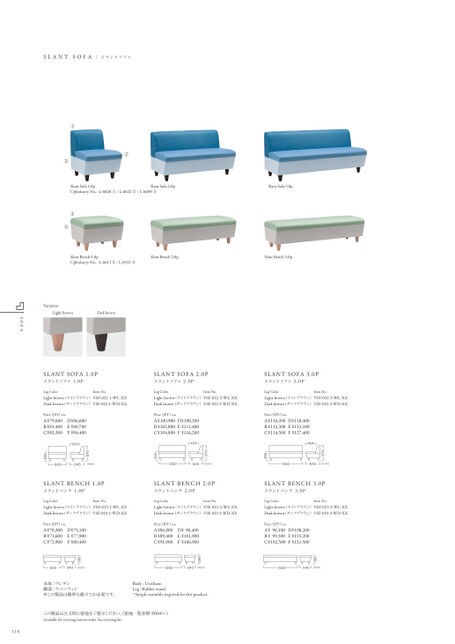 SOFASLANTSOFAスラントソファ①③②SlantSofa1.0pUpholsteryNo.:L-6628①/L-6622②/L-6609③SlantSofa2.0pSlantSofa3.0p④⑤SlantBench1.0pUpholsteryNo.:L-6613④/L-6532⑤SlantBench2.0pSlantBench3.0pVariationLightbrownDarkbrownSLANTSOFA1.0Pスラントソファ1.0PSLANTSOFA2.0Pスラントソファ2.0PSLANTSOFA3.0Pスラントソファ3.0PLegColorLightbrown(ライトブラウン)VSF-022-1-WL-XXDarkbrown(ダークブラウン)VSF-022-1-WD-XXItemNo.LegColorLightbrown(ライトブラウン)VSF-022-2-WL-XXDarkbrown(ダークブラウン)VSF-022-2-WD-XXItemNo.LegColorLightbrown(ライトブラウン)VSF-022-3-WL-XXDarkbrown(ダークブラウン)VSF-022-3-WD-XXItemNo.Price(JPY)/ea.A¥79,600B¥81,400C¥83,300D¥86,600E¥90,700F¥94,400Price(JPY)/ea.A¥100,900B¥102,800C¥104,800D¥108,200E¥112,400F¥116,200Price(JPY)/ea.A¥110,200B¥112,300C¥114,500D¥118,400E¥123,100F¥127,40045445467067039567060(mm)10(mm)645(mm)1502006451500(mm)(m6451500()645(mm)454454395454670395395670670395645645454454600645(mm)600645(mm)1200600670395395454670395454395(mm)5401500540LegColorLightbrown(ライトブラウン)VSF-023-3-WL-XXDarkbrown(ダークブラウン)VSF-023-3-WD-XX454(mm)ItemNo.454395SLANTBENCH3.0Pスラントベンチ3.0P395(mm)(mm)15003953955405405401200(mm)(mm)LegColorLightbrown(ライトブラウン)VSF-023-2-WL-XXDarkbrown(ダークブラウン)VSF-023-2-WD-XX1200(mm)00ItemNo.54054045445444395SLANTBENCH2.0Pスラントベンチ2.0P395395(mm)670D¥108,200645E¥115,200F¥121,500(mm)670Price(JPY)/ea.A¥96,100645B¥99,300C¥102,500153956455(mm)1500(mm)6706703951500(mm)10670D¥96,400E¥101,900F¥106,900645395395Price(JPY)/ea.A¥86,800B¥89,400C¥91,9001200670670(m(mm3956456454544395540(mm)1200600600540(mm)600395SLANTBENCH1.0Pスラントベンチ1.0PLegColorLightbrown(ライトブラウン)VSF-023-1-WL-XXDarkbrown(ダークブラウン)VSF-023-1-WD-XXItemNo.454454670395395600645(mm)1200600670395645D¥75,100E¥77,900F¥80,400(mm)Price(JPY)/ea.A¥70,300B¥71,600C¥72,900600395395395395395395395395395395600540(mm)600540(mm)60020054050(mm)(m)1200540(mm)1010540540(mm)(m)1500540(mm)1500540(mm)本体:ウレタン脚部:ラバーウッド※この製品は簡単な組立てが必要です。Body:UrethaneLeg:Rubberwood*Simpleassemblyrequiredforthisproduct.この製品は注文時に張地をご指示ください。張地一覧参照P604〜)Availableforcoveringcustom-order.Seecoveringlist.318