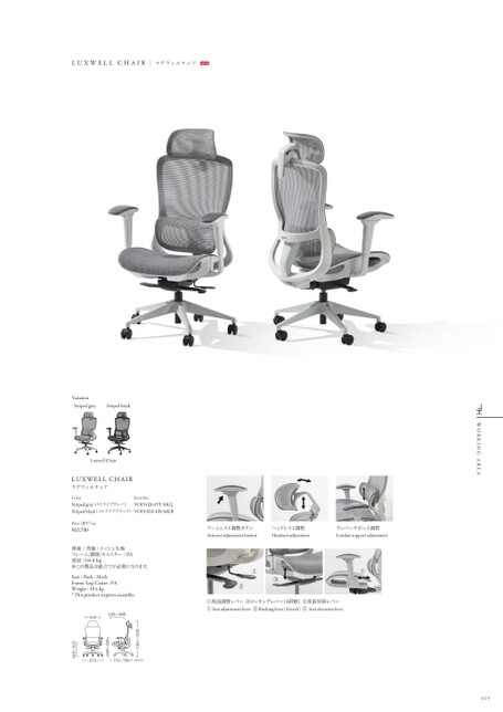 アームレスト調整ボタンArmrestadjustmentbuttonヘッドレスト調整Headrestadjustmentランバーサポート調整Lumbarsupportadjustment①②③①①座面調整レバー②ロッキングレバー(4段階)③座面昇降レバー①Seatadjustmentlever②Rockinglever(4levels)③Seatelevationlever415LuxwellChairLUXWELLCHAIRラグウェルチェアItemNo.ColorStripedgray(ストライプグレー)VOH-026-HT-MGLStripedblack(ストライプブラック)VOH-026-KB-MKBPrice(JPY)/ea.¥63,700座面/背面:メッシュ生地フレーム/脚部/キャスター:PA重量:18.4kg※この製品は組立てが必要になります。Seat/Back:MeshFrame/Leg/Caster:PAWeight:18.4kg*Thisproductrequiresassembly.440425~4951165~1305665~825675710~780(mm)440~520VariationStripedgrayStripedblackLUXWELLCHAIRラグウェルチェアNEW