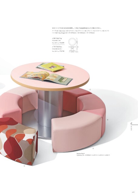 KIDS439⑦⑥⑤RainbowBenchUpholsteryNo.:参考張地④/L-6571⑤/L-6576⑥/L-6583⑦φ90030Hφ290φ750(mm)P320φ900TableTopVCK-008-□-90Price(JPY)/ea.¥34,000P320□34030470φ750TableBaseVCK-008-SG-H□Price(JPY)/ea.¥76,700φ290520(mm)φ750(mm)□340φ290φ75030P320570□340φ29030φ750(mm)④※左ページ下の注文方法を参照し、□内に下記品番を記入してご指示ください。テーブル色TableColor:HT(ホワイト)/YG(グリーン)/BU(ブルー)/YL(イエロー)/PK(ピンク)ベース高さBaseHeight(H):47(470mm)/52(520mm)/57(570mm)φ900φ900φ900