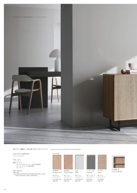 LECTOCABINETレクトキャビネット扉デザインと脚部を、自由に選べるキャビネットシリーズ。Acabinetserieswhereyoucanfreelychoosethedoordesignandlegs.LECTOCABINETレクトキャビネットDoorDesign本体:メラミンエッジ:オーク脚部:J1:オークJ2:アルミ(CP:ポリッシュ/KB:粉体塗装)J3:スチール(メラミン焼付塗装)J4:メラミンBody:MelamineEdge:OakLeg:J1:Oak/J2:Aluminum(CP:polish/KB:powdercoated)J3:Steel(Melaminecoated)/J4:Melamine480木目縦扉Woodgrainvertical木目斜扉Woodgraindiagonal白扉Whiteファブリック扉Upholsteryラタン扉Rattan面:メラミンエッジ:オークFace:MelamineEdge:Oak面:メラミンエッジ:オークFace:MelamineEdge:Oak面:メラミンエッジ:オークFace:MelamineEdge:Oak面:ファブリックエッジ:オークFace:FabricEdge:Oak面:ラタンエッジ:オークFace:RattanEdge:Oak※可動棚一枚*Onemovableshelf