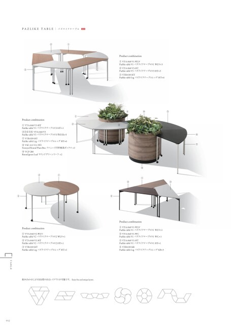 TABLEPAZLIKETABLEパズライクテーブルNEW②①③①Productcombination②①VTA-040-V3-HTPazliketableV3パズライクテーブルV3HT×1②③④⑤⑥VTA-040-V3PazliketableV3パズライクテーブルV3特注色×5⑦VTB-039-HTPazliketableLegパズライクテーブルレッグHT×6⑧VSF-112-V11-WFFunnyedRoundPlantBoxファニード円形植栽ボックス×2⑨VCP-288RoundgreenLeafラウンドグリーンリーフ×2②①Productcombination①VTA-040-V1-WLVPazliketableV1パズライクテーブルV1WLV×3②VTA-040-V3-HTPazliketableV3パズライクテーブルV3HT×3③VTB-039-HTPazliketableLegパズライクテーブルレッグHT×6④⑨⑤③⑧①②③⑥⑦③④Productcombination①VTA-040-V2-WLVPazliketableV2パズライクテーブルV2WLV×1②VTA-040-V2-HTPazliketableV2パズライクテーブルV2HT×1③VTB-039-HTPazliketableLegパズライクテーブルレッグHT×2Productcombination①VTA-040-V1-WLVPazliketableV1パズライクテーブルV1WLV×1②VTA-040-V1-WCPazliketableV1パズライクテーブルV1WC×1③VTA-040-V1-HTPazliketableV1パズライクテーブルV1HT×1④VTB-039-KBPazliketableLegパズライクテーブルレッグKB×3組み合わせにより自由度のあるレイアウトが可能です。Enjoyfreeanduniquelayout.552