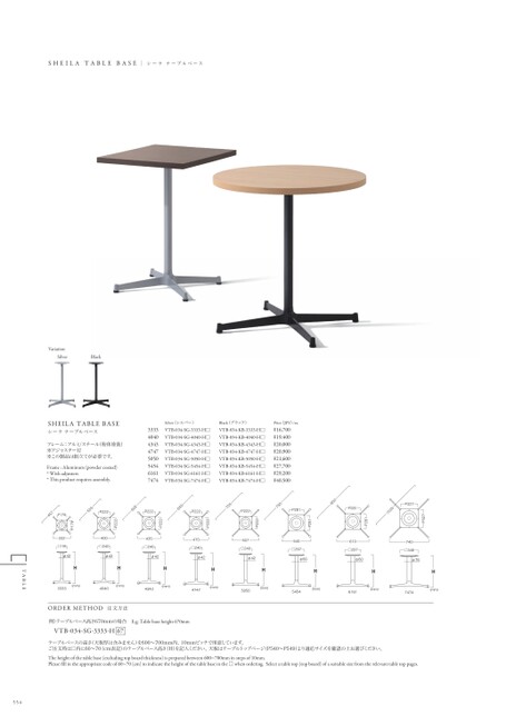 SHEILATABLEBASEシーラテーブルベースVariationSilverBlackSHEILATABLEBASEシーラテーブルベースフレーム:アルミ/スチール(粉体塗装)※アジャスター付※この製品は組立てが必要です。Frame:Aluminum(powdercoated)*Withadjusters*Thisproductrequiresassembly.33334040434347475050545461617474Silver(シルバー)VTB-034-SG-3333-H□VTB-034-SG-4040-H□VTB-034-SG-4343-H□VTB-034-SG-4747-H□VTB-034-SG-5050-H□VTB-034-SG-5454-H□VTB-034-SG-6161-H□VTB-034-SG-7474-H□Black(ブラック)VTB-034-KB-3333-H□VTB-034-KB-4040-H□VTB-034-KB-4343-H□VTB-034-KB-4747-H□VTB-034-KB-5050-H□VTB-034-KB-5454-H□VTB-034-KB-6161-H□VTB-034-KB-7474-H□Price(JPY)/ea.¥16,700¥19,400¥20,000¥20,900¥21,600¥27,700¥29,200¥40,500540□297φ605454H(mm)H(mm)610□297φ606161H(mm)740□346φ767474H(mm)P327P3271035P281850P281P281P222P222P222555P222602P222650P222705P222750P281435□240φ42470□240φ42507□240φ42HHHH(mm)3333(mm)40404343(mm)4747(mm)5050ORDERMETHOD注文方法例)テーブルベース高さ670mmの場合E.g.Tablebaseheight670mmVTB-034-SG-3333-H67P222400□240φ42P179332□195φ42457P179テーブルベースの高さ(天板厚は含みません)を600~700mm内、10mmピッチで用意しています。ご注文時は□内に60~70(cm表記)のテーブルベース高さ(H)を記入ください。天板はテーブルトップページ(P540~P549)より適応サイズを確認の上お選びください。Theheightofthetablebase(excludingtopboardthickness)ispreparedbetween600~700mminstepsof10mm.Pleasefillintheappropriatecodeof60~70(cm)toindicatetheheightofthetablebaseinthe□whenordering.Selectatabletop(topboard)ofasuitablesizefromtherelevanttabletoppages.554