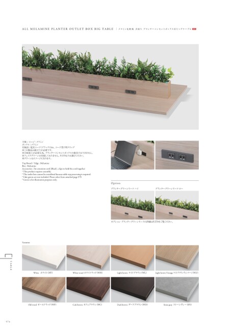 TABLEALLMELAMINEPLANTEROUTLETBOXBIGTABLEメラミン化粧板共貼りプランターコンセントボックス付ビッグテーブルNEW天板/エッジ:メラミンボックス:メラミン付属品:延長コード(ブラック)3m、コード受け用クリップ※この製品は組立てが必要です。※天板加工が必要な為、プランターコンセントボックスの後付けはできません。※フェイクグリーンは付属しておりません。P.579よりお選びください。※グリーンはイメージになります。TopBoard/Edge:MelamineBox:MelamineAccessories:3mextensioncord(Black),clipstoholdthecordtogether*Thisproductrequiresassembly.*Theoutletboxcannotberetrofittedbecausetabletopprocessingisrequired.*Fakegreensarenotincluded.Pleaseselectfromattachedpage579.*Greenisforillustrationpurposesonly.VariationOptionプランターグリーンリーフハイプランターグリーンリーフローオプションプランターグリーンリーフの詳細はP.579をご覧ください。Whiteホワイト(HT)Whitewoodホワイトウッド(WH)Lightbrownライトブラウン(WL)LightbrownVintageライトブラウンヴィンテージ(WLV)Oldwoodオールドウッド(WF)Cafebrownカフェブラウン(WC)Darkbrownダークブラウン(WD)Stonegrayストーングレー(SN)574
