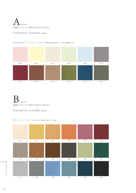 UPHOLSTERYARANK※張地ランクはメーカーの都合により変わることがあります。SYNTHETICLEATHER合成皮革PLEASANTプレザント137cm巾PVC難燃・防汚・耐移染・耐アルコール・耐次亜塩素酸ナトリウムPL-58PL-57PL-12PL-61PL-60PL-13PL-66PL-16PL-52PL-38PL-20PL-27BRANK※張地ランクはメーカーの都合により変わることがあります。SYNTHETICLEATHER合成皮革GT-Sジーティエス137cm巾PVC難燃・防汚・耐アルコール・抗菌101107138105141150104112154152137131117123120135127129606
