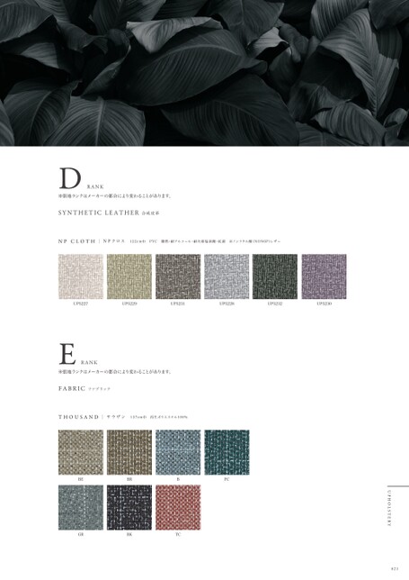 DRANK※張地ランクはメーカーの都合により変わることがあります。SYNTHETICLEATHER合成皮革NPCLOTHNPクロス122cm巾PVC難燃・耐アルコール・耐次亜塩素酸・抗菌※ノンフタル酸(NON6P)レザーUP5227UP5229UP5231UP5228UP5232UP5230ERANK※張地ランクはメーカーの都合により変わることがあります。FABRICファブリックTHOUSANDサウザン137cm巾再生ポリエステル100%BEBRBPCGRBKTC621