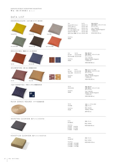 WA-BIYORIKAWAJUNPUBLICFURNITURECOLLECTIONWA-BIYORI和びよりDATALISTOBOROGASURIおぼろ絣(がすり)座布団Mustard(芥子)Chestnut(栗)Mouse(鼠)Pineneedle(松葉)Japaneseink(墨)Lightcrimson(薄紅)OKUSHIMA奥縞(おくしま)座布団Red(赤)Navyblue(紺)ASAMOYOU麻(あさ)模様座布団Red(赤)Yellow(黄)IGETAMOYOU井桁(いげた)模様座布団RUSHGRASSROUNDイグサ丸型座布団4545T40CUSHION座クッション4545T404545T120CUSHION座クッション4545T12017ColorItemNo.Mustard(芥子からし)VCS-011-YLChestnut(栗くり)VCS-011-BDMouse(鼠ねずみ)VCS-011-GLPineneedle(松葉まつば)VCS-011-GRJapaneseink(墨すみ)VCS-011-BKLightcrimson(薄紅うすべに)VCS-011-RD張地:綿100%詰物:綿90%+ポリエステル10%※ウレタン芯入Cover:Cotton100Wadding:Cotton90+Polyester10*UrethanecoreW550×D590×t100(mm)Prie(JPY)/ea.¥8,800ColorItemNo.Red(赤)VCS-010-RDNavyblue(紺)VCS-010-NVPrie(JPY)/ea.¥6,800張地:綿100%詰物:綿90%+ポリエステル10%※ウレタン芯入Cover:Cotton100Wadding:Cotton90+Polyester10*UrethanecoreW500×D500×t80(mm)ColorRed(赤)Yellow(黄)ItemNo.VCS-012-RDVCS-012-YLPrie(JPY)/ea.¥6,800張地:ポリエステル100%詰物:綿90%+ポリエステル10%※ウレタン芯入Cover:Polyester100Wadding:Cotton90+Polyester10*UrethanecoreW500×D500×t80(mm)ItemNo.VCS-013-NVPrie(JPY)/ea.¥6,800ItemNo.VCS-006Prie(JPY)/ea.¥5,200ItemNo.VCS-008-XXPrice(JPY)/ea.A¥5,200B¥5,500C¥5,900D¥6,700E¥7,500F¥8,200ItemNo.VCS-007-XXPrie(JPY)/ea.A¥13,600B¥14,000C¥14,600D¥15,800E¥16,800F¥17,900張地:綿100%詰物:綿90%+ポリエステル10%※ウレタン芯入Cover:Cotton100Wadding:Cotton90+Polyester10*UrethanecoreW500×D500×t80(mm)本体:シーグラス(い草)詰物:ウレタンBody:SeagrassWadding:Urethaneφ450×t20(mm)本体:ウレタンBody:UrethaneW450×D450×t40(mm)本体:ウレタンBody:UrethaneW450×D450×t120(mm)