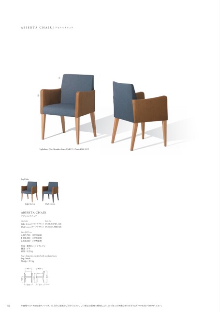 ABIERTACHAIRアビエルタチェア①②UpholsteryNo.:MoridenGrainDMB①/OsakaSBA-01②LightbrownDarkbrownABIERTACHAIRアビエルタチェアLegColorLightbrown(ライトブラウン)VCH-203-WL-XXDarkbrown(ダークブラウン)VCH-203-WD-XXItemNo.Price(JPY)/ea.A¥87,700B¥88,500C¥90,500D¥93,000E¥96,000F¥98,800座面:軟質モールドウレタン脚部:ブナ重量:9.2kgSeat:InjectionmoldedsofturethanefoamLeg:beechWeight:9.2kg451430560571(mm)801640430LegColor82※価格のA~Fは張地ランクです。注文時に張地をご指示ください。この製品は張地の種類により、張り加工が困難なものがありますのでお問い合わせください。